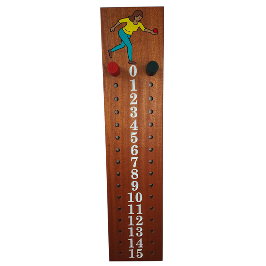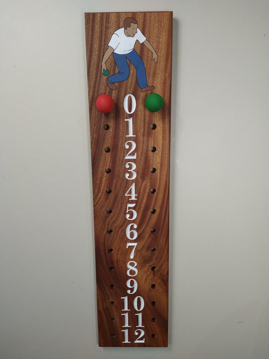 Bocce scoreboard | Mahogany | Male bocce player engraved image | 6"WIDE.