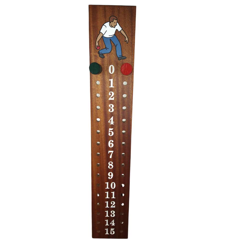 Beautiful mahogany bocce scoreboard with bocce player image carved and hand-painted at the top. Add an elegant touch to your beautiful bocce court with this 32" tall x 5-3/4" wide bocce scorekeeper. This scoreboard is narrower than our standard 8" wide, but with the same quality. A must-have for your bocce court. Comes with 2 large scoring pegs and numbered #0-12, #0-15, #0-21 Easy keyhole mounting hardware included. Please view our store for more options available. Don't see what you're looking for? Email us with your suggestions. boccesupplies@gmail.com