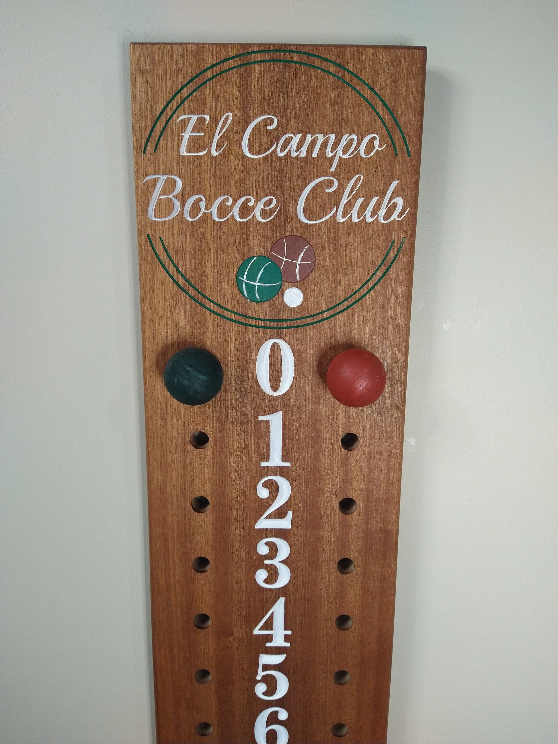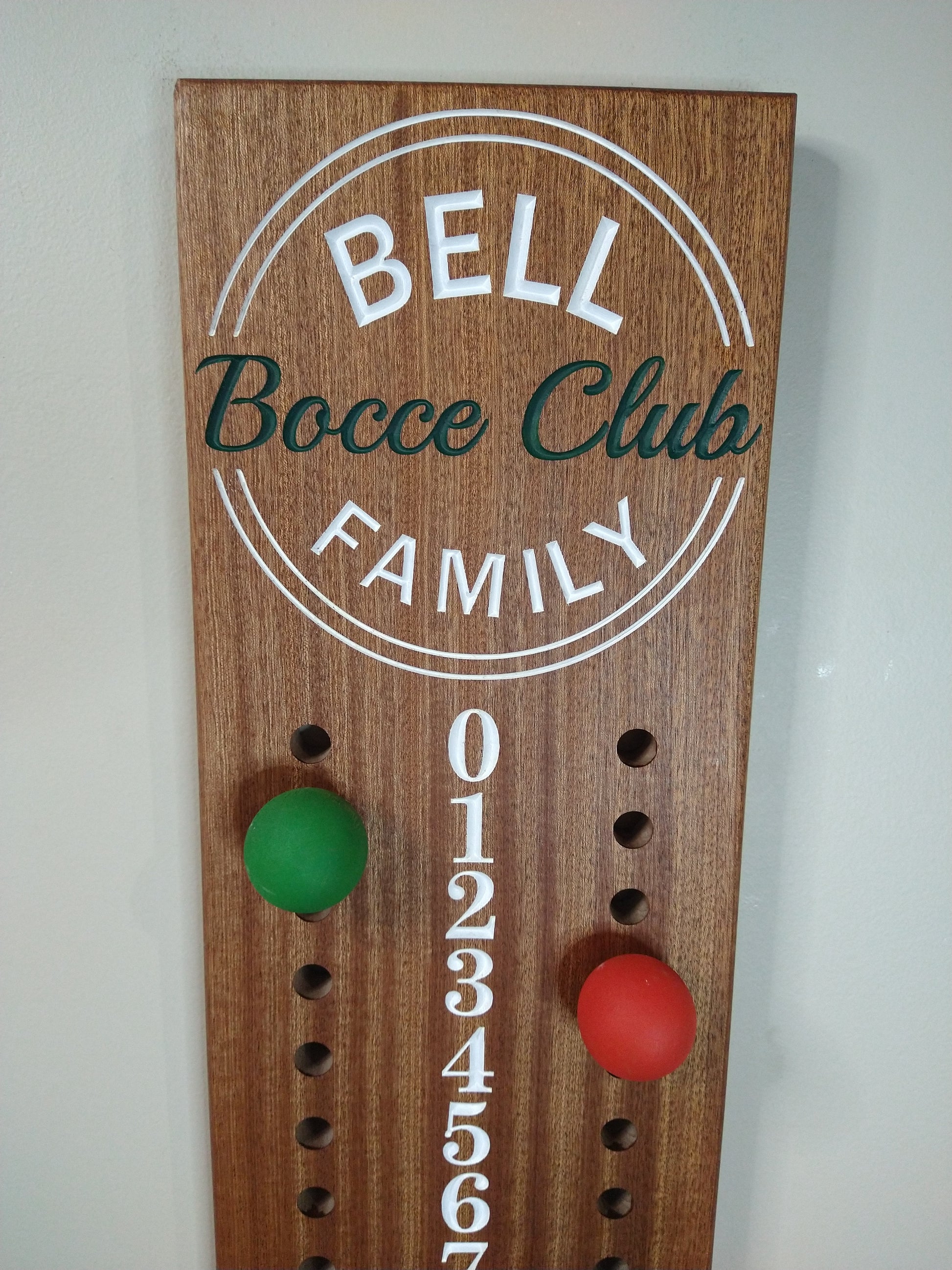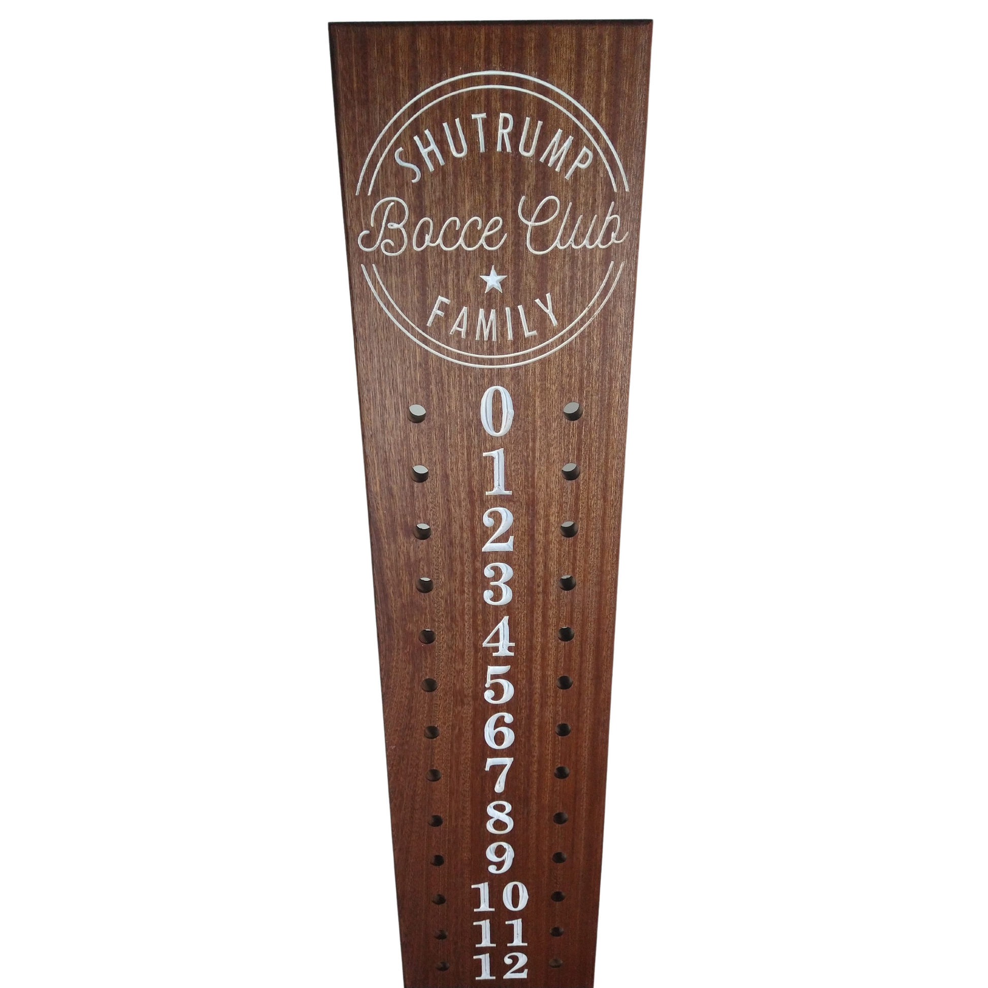 Personalized bocce scoreboard! Add your family name to your scoreboard, choose from 2 styles. Scoreboards are 32" tall by 7 -1/4" wide. Includes two scoring pegs and mounting screws. Keyhole fasteners are installed on the back for easy installation. This is the perfect gift for any occasion. Scoreboards are CNC engraved, rubbed with Teak oil for outdoor durability. All carved numbers and logos are colored with durable outdoor paint.