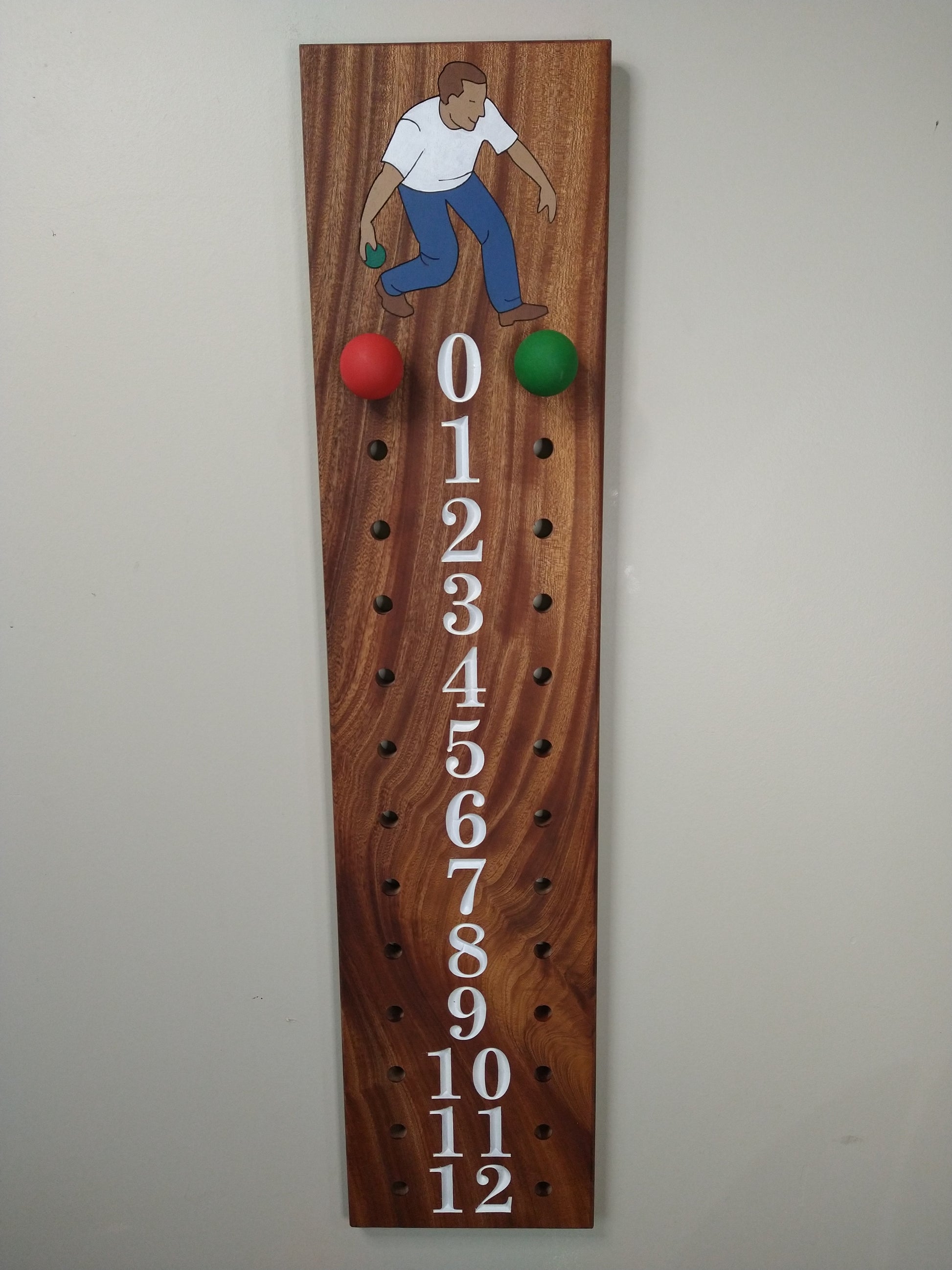 This is a full-size wooden bocce scoreboard 32" tall x 7-1/4" wide x 3/4" thick Numbers, #0-12, #0-15, #0-21 A Carved and hand-painted Image of a Male bocce player added to the top of the scoreboard adds fun and character to your scorekeeper. This will be the perfect addition to your bocce court, everyone will ask where you got it! Comes with 2 pegs, and keyhole hangers with screws for easy installation. The scoreboard is treated with natural oils to preserve its beauty. Customizing is available. We make these full-size scoreboards so everyone can see the scorekeeper from wherever they are standing around the bocce court. PLEASE NOTE Each sign we make will have a slightly different wood grain. Mahogany is a tough tight-grained wood with red-brown color. It resists shrinking, checking, and splintering, making mahogany a perfect wood for outdoor furniture and signs. All scoreboards are custom-made here in our workshop in the USA.