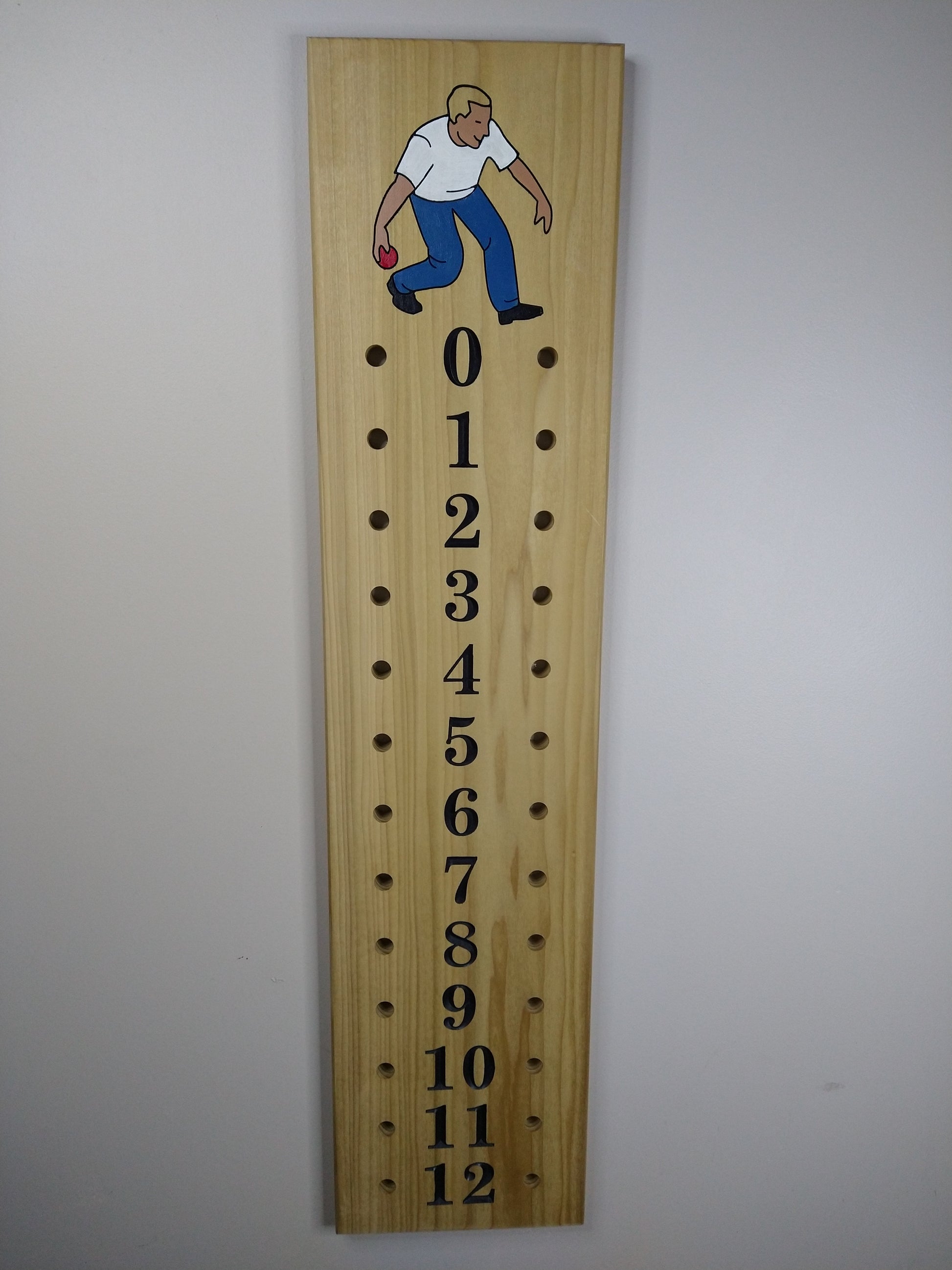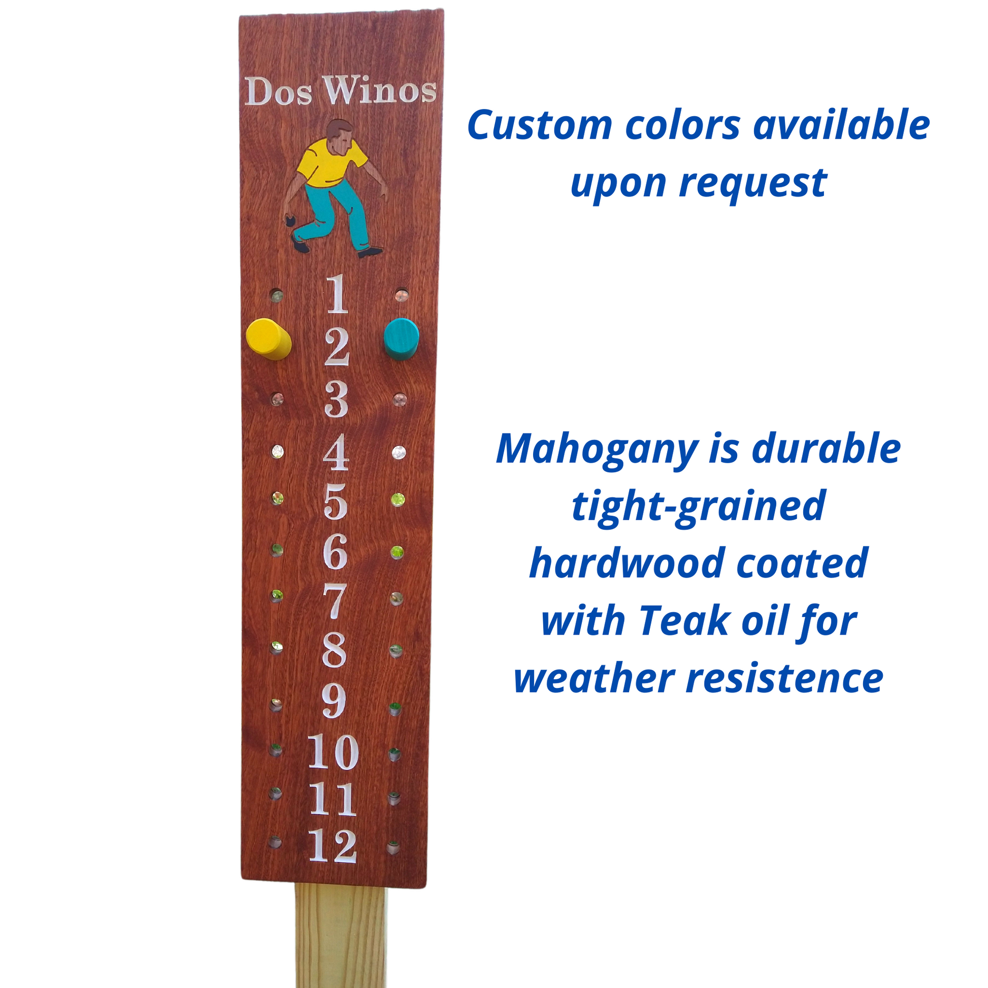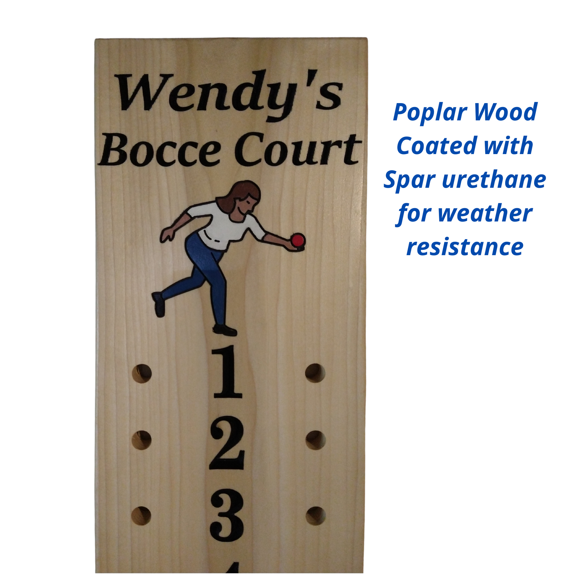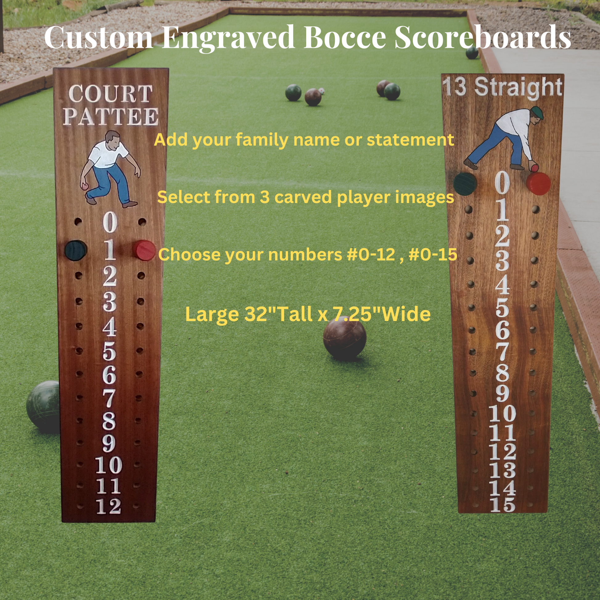 Personalize your bocce scoreboard with different options. Add your family name or specific saying, player image, and choose numbers #0-12, #0-15, #0-21. The large size (32" High x 7-1/4" wide) is easily seen from the far end of the court. All scoreboards now begin with #0., made of mahogany wood with white letters and numbers. The image is carved and hand-painted. Mahogany is coated with teak oil to preserve beauty and add durability. For ease of installation, 2 keyhole hangers are installed on the backside. If you don't need any personalization, please see our standard scoreboards in our store. Please write your personalization requests exactly how you want it to show at checkout. Up to 18 characters are allowed. If you want the scoreboard to say more, please email us for more information.