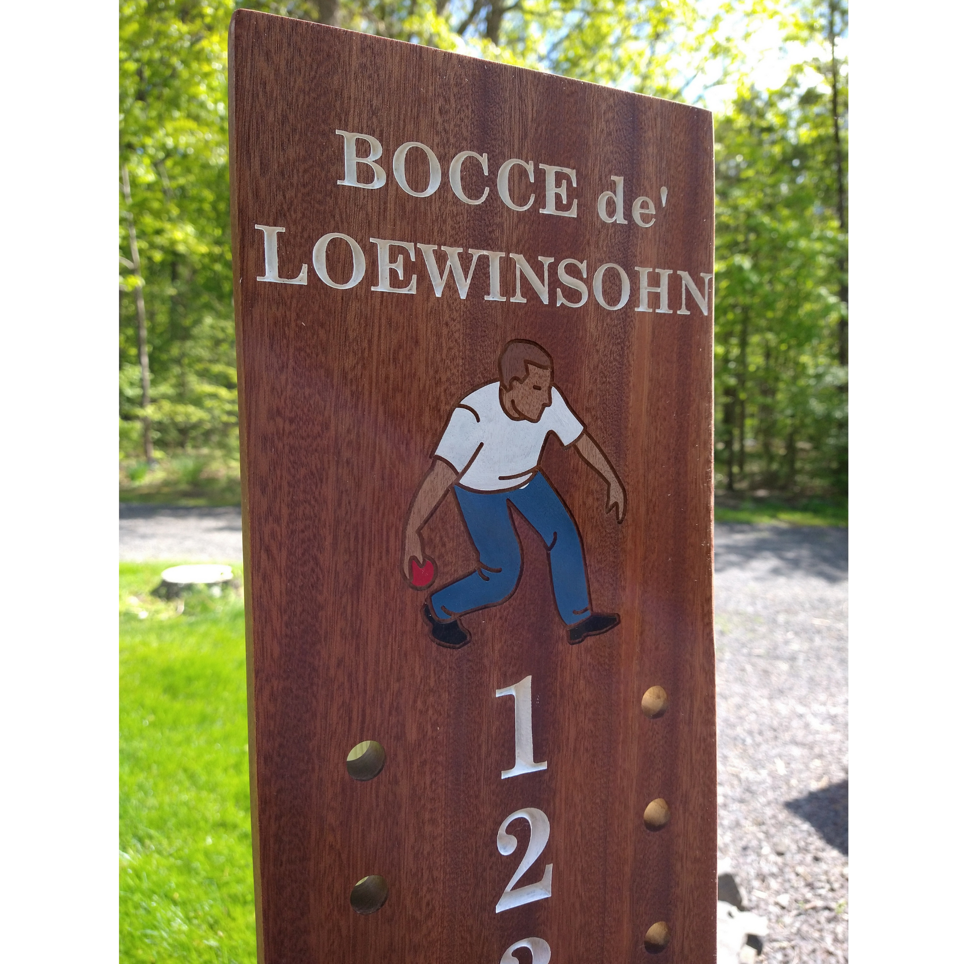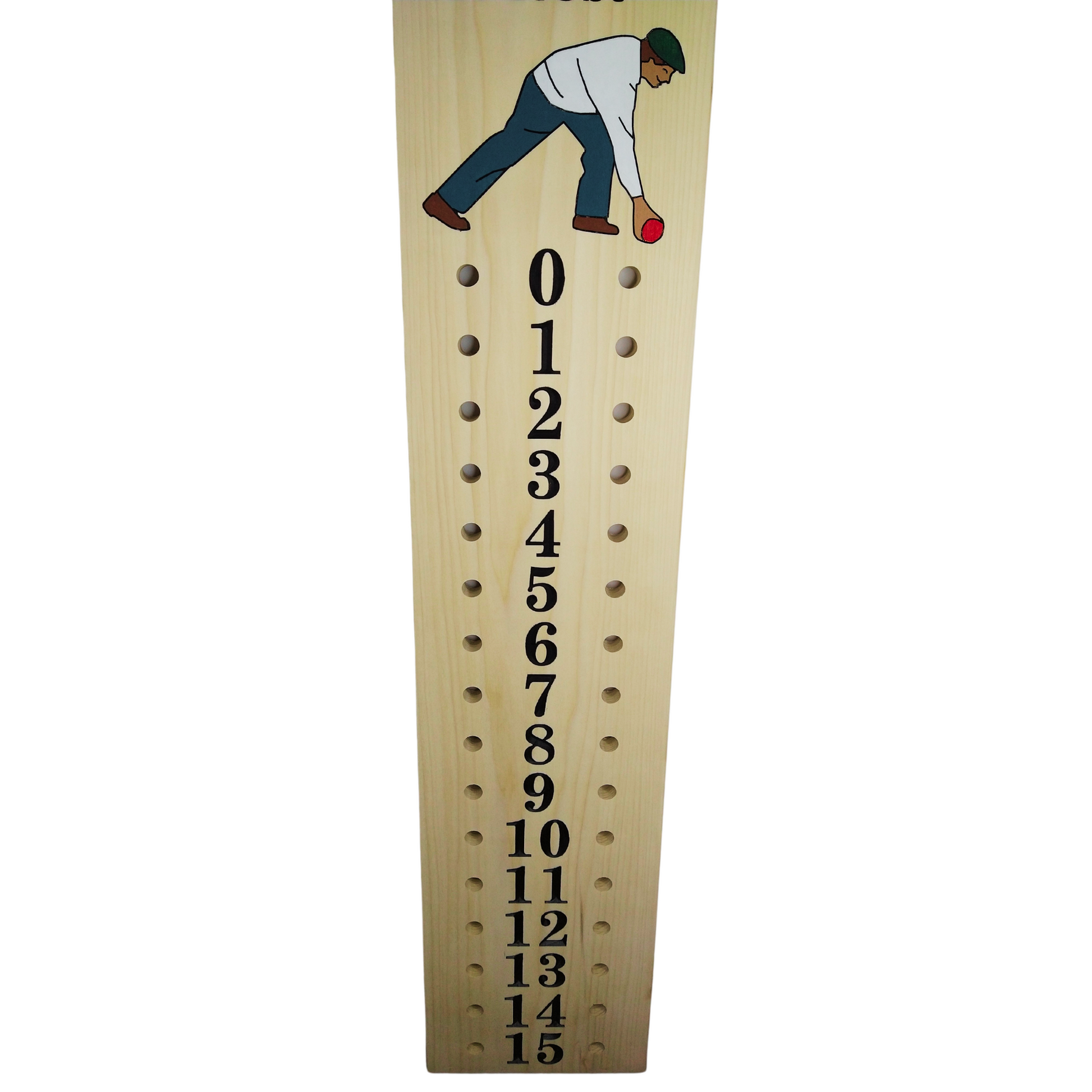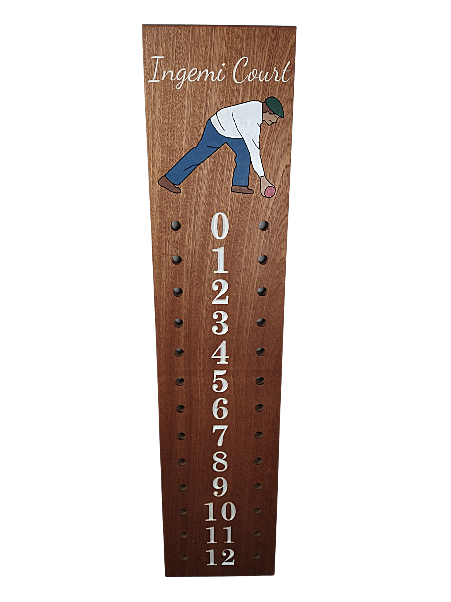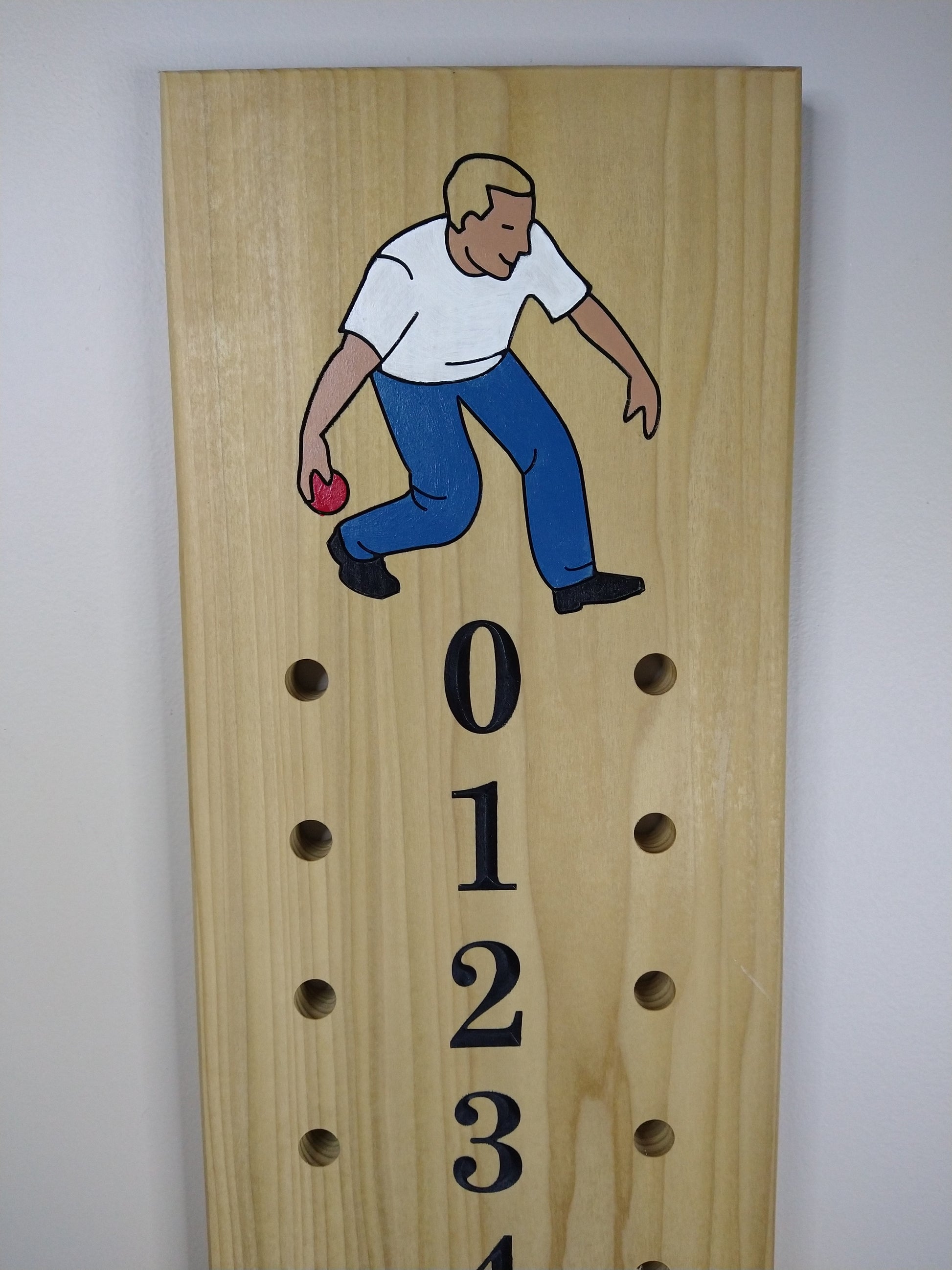 Personalize your bocce scoreboard with different options. Add your family name or specific saying, player image, and choose numbers #0-12, #0-15, #0-21. The large size (32" High x 7-1/4" wide) is easily seen from the far end of the court. All scoreboards now begin with #0., made of mahogany wood with white letters and numbers. The image is carved and hand-painted. Mahogany is coated with teak oil to preserve beauty and add durability. For ease of installation, 2 keyhole hangers are installed on the backside. If you don't need any personalization, please see our standard scoreboards in our store. Please write your personalization requests exactly how you want it to show at checkout. Up to 18 characters are allowed. If you want the scoreboard to say more, please email us for more information.